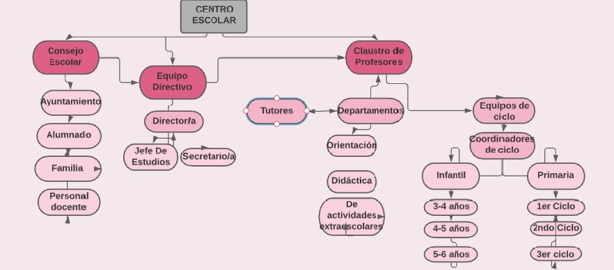 Este es el organigrama de nuestro centro, esta dividido en Consejo Escolar, equipo directivo y el claustro de profesores, estos son los principales puestos en los que se divide el centro. Dentro del consejo escolar nos encontramos con el Ayuntamiento, el alumnado, la familia y el personal docente. Todos estos forman y influyen en las decisiones que toma el Consejo Escolar